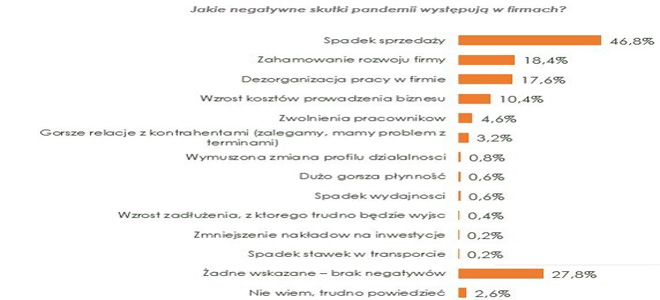 Research dla BIG InfoMonitor Najbardziej dotkliwym skutkiem koronakryzysu jest spadek sprzedaży, na co wskazuje niemal 47 proc. badanych, przede wszystkim firmy mikro i małe. Na kolejnych miejscach znalazły się: zahamowanie rozwoju przedsiębiorstwa (ponad 18 proc.) i dezorganizacja pracy (prawie 18 proc.), ta ostatnia dokucza akurat najbardziej firmom małym i średnim. Jeśli chodzi o zwolnienia to stan pandemii do IV kw. 2020 r. wymusił je u nielicznych, bo redukcje zatrudnienia deklaruje mniej niż 5 proc. firm, w jeszcze mniejszym stopniu pogorszył relacje z kontrahentami – w 3 proc. przypadków. Na koniec listopada 2020 r. w Rejestrze Dłużników BIG InfoMonitor oraz BIK firm opóźniających płatności wobec dostawców i banków było prawie 321 tys. firm, ich zaległości wynosiły 34,15 mld zł. Źródło: BIG InfoMonitor / Halina Kochalska. Badanie zrealizowane przez agencję Maison&Partners metodą CAWI na panelu badawczym Ariadna. Próba ogólnopolska licząca N=627 przedstawicieli sektora MŚP. Struktura próby w badaniu reprezentatywna dla przedsiębiorstw ze względu na wielkość firmy. Termin: 16 –23 grudnia 2020 r. Badanie wykonane przez Keralla Research w ramach projektu „Skaner MŚP”, prowadzonego co kwartał na próbie N=500 mikro, małych i średnich firm. Technika wywiady telefoniczne. Termin: październik 2020 r. dodano: 2021-03-08 07:20:09 |