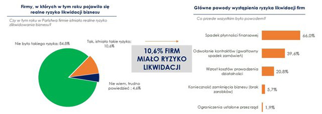 Grzelczak.Prawie 11 proc. mikro, małych i średnich firm wskazywało, że w minionym roku istniało realne ryzyko zlikwidowania ich biznesu, wynika z badania przeprowadzonego przez Keralla Research na zlecenie Rejestru Dłużników BIG InfoMonitor w IV kw. 2020 r. O takim niebezpieczeństwie przede wszystkim mówiły firmy mikro zatrudniające od 1 do 9 osób (16,1 proc.) i małe, gdzie pracuje 10-49 osób (10,5 proc.). Zdecydowanie pewniej czuły się natomiast średnie podmioty (50-249 zatrudnionych), bo tylko 1 proc. z nich dostrzegało ryzyko upadłości. Uwaga na płynność finansową Najczęstszymi powodami ryzyka likwidacji, wymienianymi w badaniu, był spadek płynności finansowej (66 proc.), odwołanie kontraktów i gwałtowny odpływ zamówień (39,6 proc.), a także wzrost kosztów prowadzenia działalności (20,8 proc.). ![]() Źródło: badanie Keralla Research dla BIG