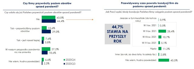 badanie Maison&Partners dla BIG InfoMonitor Powrót obrotów oddalają kolejne lockdowny Skąd tak pesymistyczne wizje? Wydłużający się koronakryzys oznacza dla przedsiębiorców pogłębiającą się niepewność. W listopadzie i na przełomie roku znów doszło do lockdownów, a jeszcze przed ich rozpoczęciem 43 proc. przedsiębiorstw nie udało się przywrócić obrotów sprzed pandemii. Na starcie czwartego kwartału spora część doświadczonych w ten sposób firm przewidywała, że nastąpi to w drugim (28,4 proc.) i trzecim kwartale (10,7 proc.) tego roku. 11 proc. uważało, że już nigdy, a 40 proc. trudno było prognozować. – Kolejne ograniczenia sprawiły, że nawet te mało optymistyczne przewidywania stały się nieaktualne i perspektywa powrotu do poziomu obrotów sprzed Covid-19 w najlepszym przypadku przesuwa się w czasie – mówi Sławomir Grzelczak. ![]() Źródło: badanie Keralla